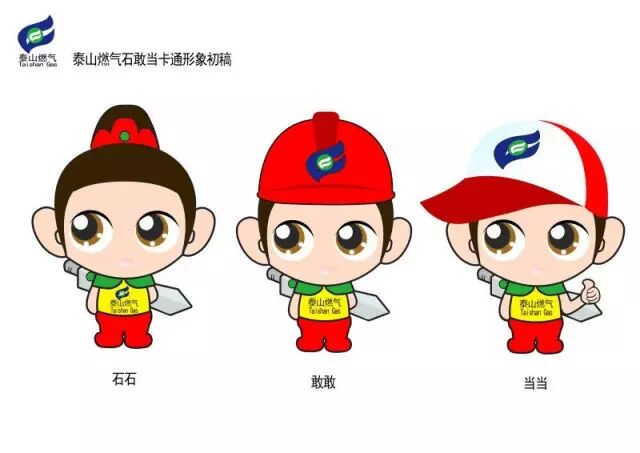 泰山燃气石敢当系列卡通形象取自“泰山石敢当”平安、幸福之喻意,该系列卡通形象共由“石石”、“敢敢”、“当当”三个形象组成,黄色马甲是燃气的标志色,绿色衣领代表燃气绿色环保,红色帽子、裤子是对燃气安全操作的警示。该系列形象彰显了泰山燃气集团“泰山燃气,让您满意”的核心文化理念,是对“泰山燃气人”实干精神的诠释,也是对燃气事业安全稳定的憧憬。
