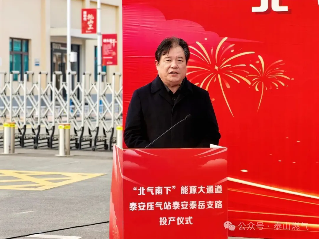 1月30日上午,“北气南下”能源大通道泰安压气站泰安泰岳支路正式投产运行。泰山城建集团党委书记、董事长赵传星,国家石油天然气管网集团有限公司山东分公司泰安作业区党支部书记、经理黄鑫,泰安市岱岳区道朗镇党委书记陈思亮,泰安市泰岳燃气有限公司党支部书记、执行董事、总经理陈世峰及各参建单位代表共40余人出席投产仪式。